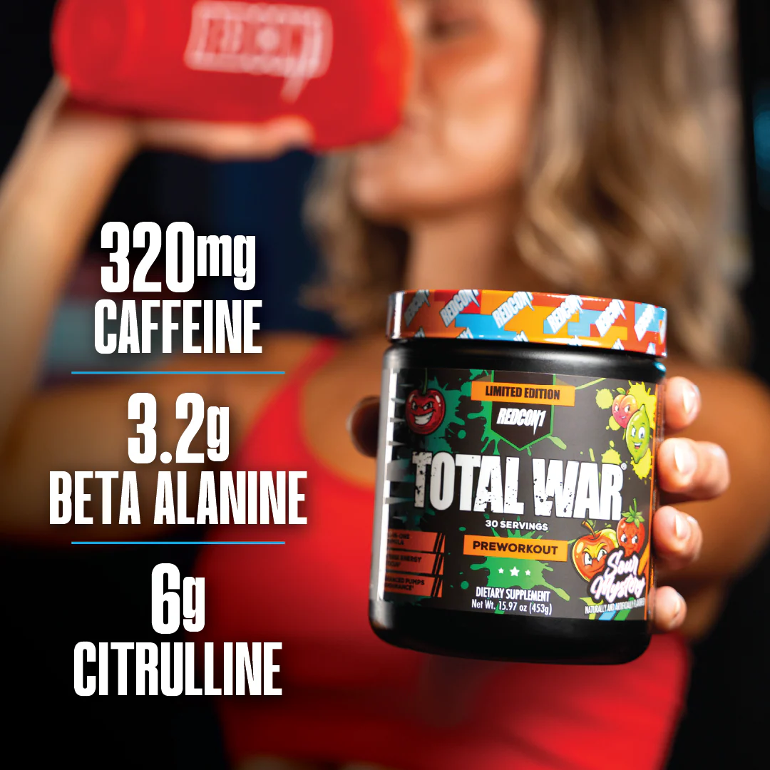 Sour Mystery delivers a mouthwatering blast of sweet-and-sour goodness that makes preworkout taste like a treat. Bold, sour, and delicious—this is preworkout you’ll actually look forward to drinking. Inside every scoop you’ll still get the explosive energy, insane pumps, and relentless endurance TOTAL WAR™ is known for—but now with a flavor so good, it feels like a treat.
